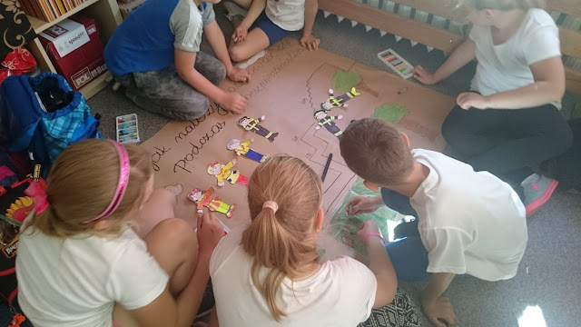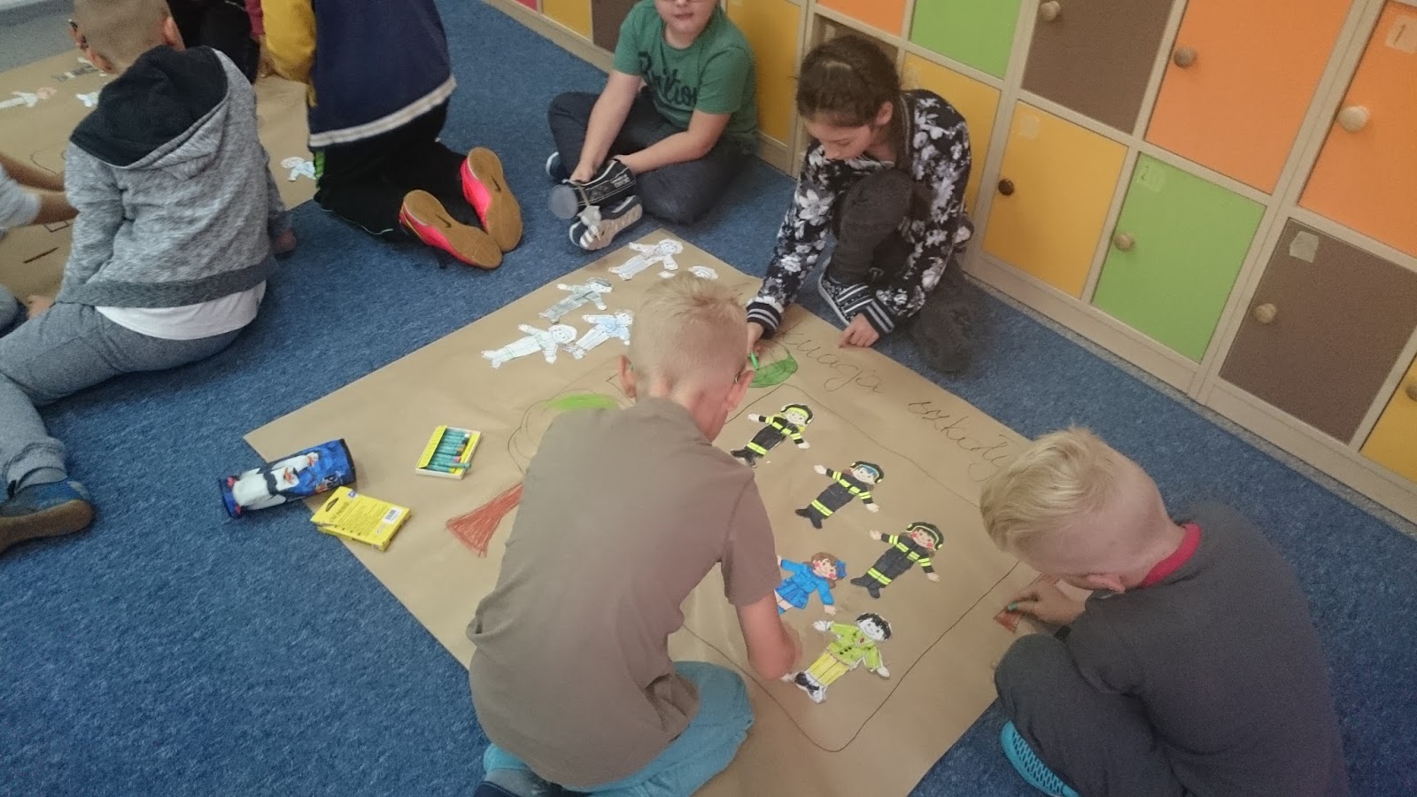 My w naszej klasie w grupach wykonaliśmy na edukacji plastyczno-technicznej pracę na temat "Bezpiecznej ewakuacji." Gotowe prace zawiesiliśmy na szkolnym korytarzu, by wszyscy przechodzący mogli zapamiętać na czym polega skuteczna ewakuacja w razie niebezpieczeństwa.